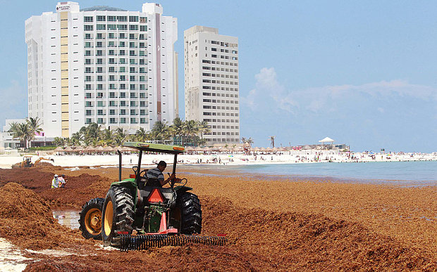 The beautiful blue Caribbean has been battling climate change in its own way lately. Off the coast of Bermuda, there has always floated a 2 million acre area of sargassum seaweed, called the Sargasso Sea. This area is also sometimes called "the rainforest of the sea", as it is an area that provides shelter and life to a host of plants and animals. Periodically, some of the seaweed floats free and drifts to shore on beaches across the Caribbean. According to an article in the Riviera Maya News, climate change is the probable cause of the huge influx of sargassum seaweed that has been coming ashore all along the Mayan Riviera for the last few years. Low wind levels and higher temperatures than normal have brought masses of this seaweed ashore not only along the Mexican coast, but on all the islands and other beaches surrounding the Caribbean. It is common for the seaweed to wash ashore during the summer, and most hotels and beach resorts employ "beach gardeners" to collect and remove the seaweed every morning before the tourists go out to the beach. Since 2011, the amount of seaweed has been increasing and apparently this year, it has been quite unmanageable. It has gotten so bad that earlier this month, a committee was formed with representatives from both Quintana Roo's environmental authorities and from the hotel industry to come up with a plan to handle the excess seaweed. A reporter in Trinidad writes that the excess of sargassum may in fact be preventing some turtles from burying their eggs and nesting on the beaches. Some are doing their best to make lemonade out of lemons, however. A Jamaican newspaper reports that Grenada is considering exporting its seaweed to China, for use as a fertilizer. We'll keep reporting on this developing story.