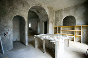 One of the required elements of whatever new house we were going to build was an outdoor bathtub, and we’re happy to say that this particular dream is coming true more beautifully than we had imagined it. Our bathtub is located on the terrace outside the master and guest bathrooms. It has been roughly shaped out of concrete block and then sculpted with layers of cement. We’ve designed an “infinity” tub, so it can be filled to the top, and overflow into a surrounding channel that will eventually be filled with white river rocks. Next to the tub is a lounge area for lying in the sun, or sitting and talking to whoever is in the tub. All of this will eventually be covered with a chicum finish, the same finish that will surround the pool and the outdoor banquettes.