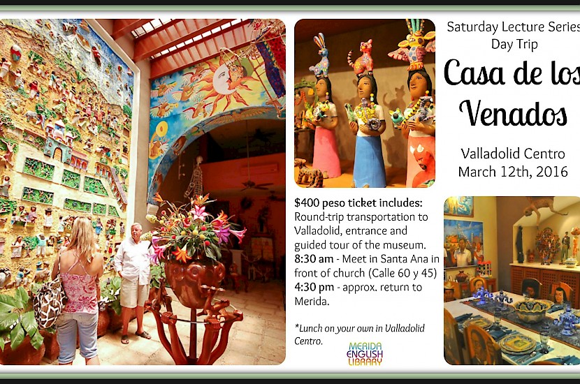 Go with the Merida English Library on a tour of the wonderful Casa de los Venados in Valladolid. Includes transportation from Merida and back.